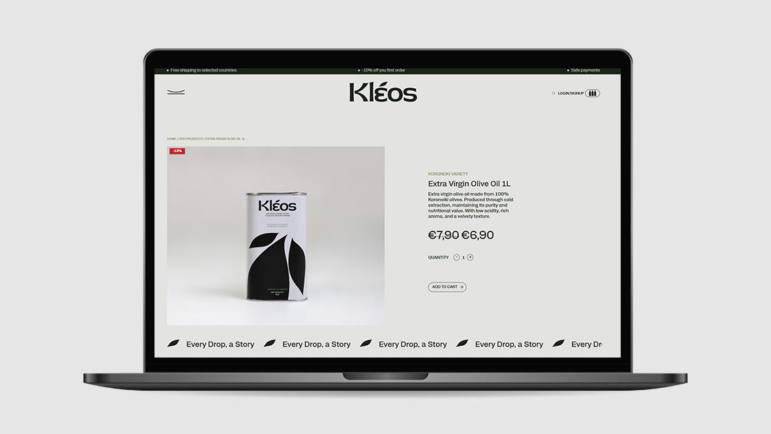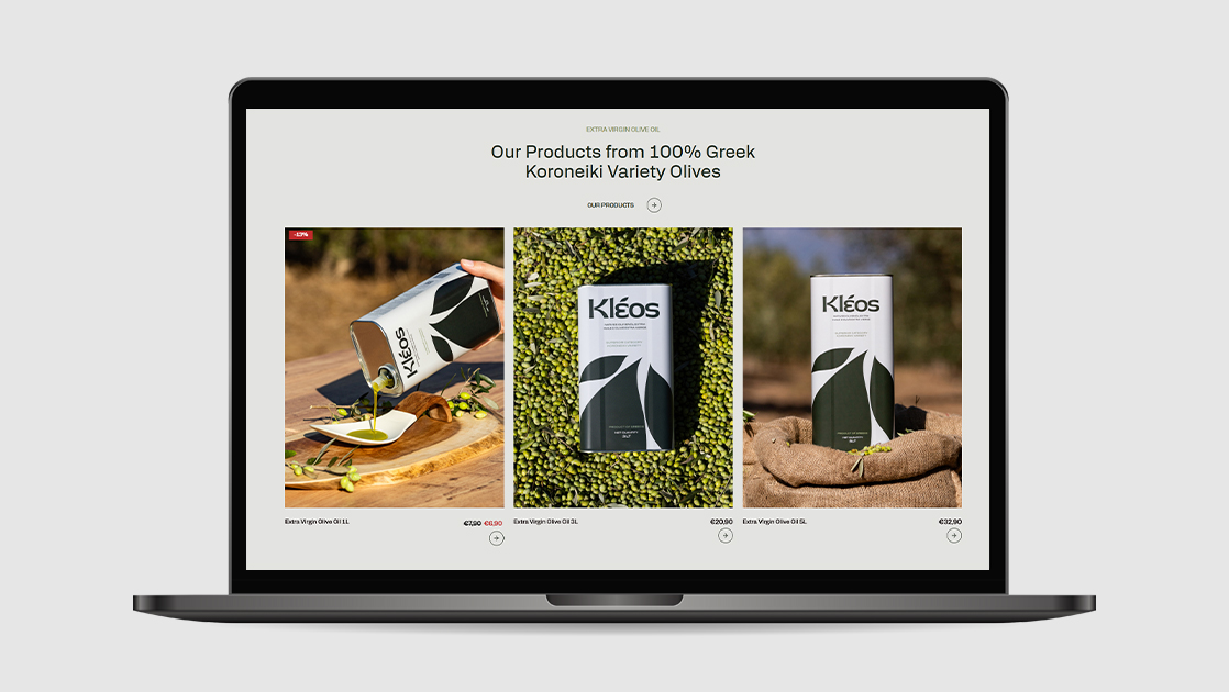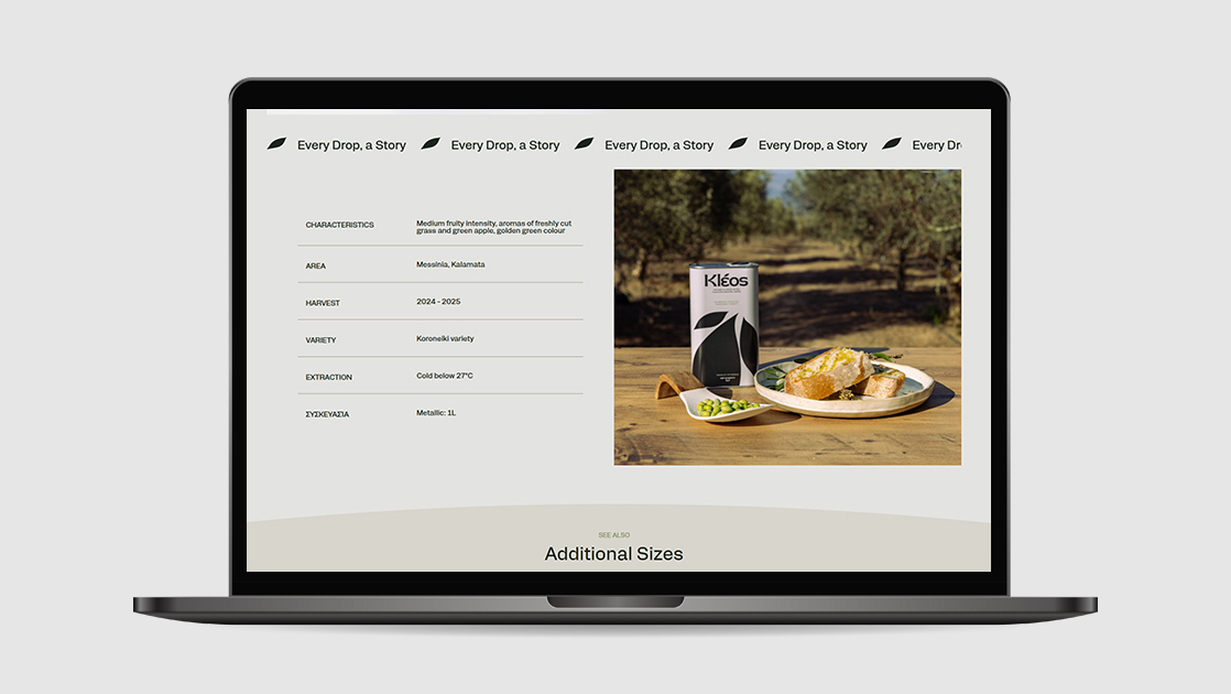 Αναλάβαμε το πλήρες Redesign της συσκευασίας, επιδιώκοντας να συνδυάσουμε την παραδοσιακή αισθητική με μοντέρνα στοιχεία, ώστε να εκφράζεται η αυθεντικότητα και η ποιότητα της Kleos. Παράλληλα, σχεδιάσαμε και αναπτύξαμε το ηλεκτρονικό κατάστημα με βάση το WordPress, εξασφαλίζοντας εύκολη πλοήγηση, υψηλή απόδοση και προσαρμοστικότητα στις ανάγκες των διεθνών αγορών.