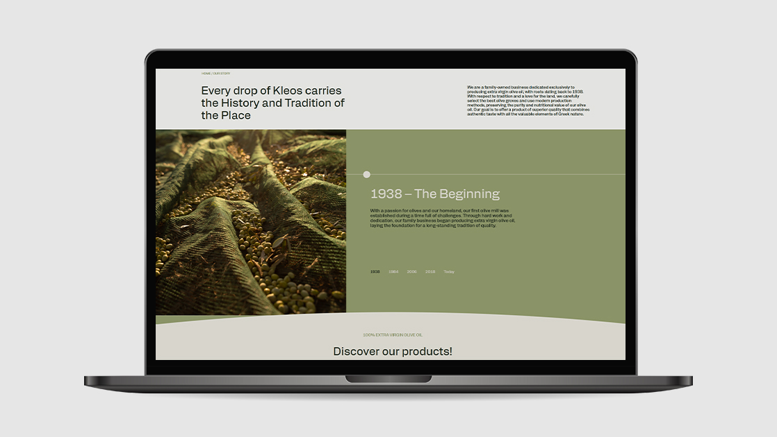 Η Kleos αντλεί το όνομά της από την αρχαία ελληνική λέξη “Κλέος”, που σημαίνει “ακοή” ή “φήμη”. Στην ελληνική μυθολογία και τα ομηρικά έπη, το “Κλέος” αντιπροσωπεύει την τιμή και τη δόξα που κερδίζεται μέσα από γενναίες πράξεις και επιτεύγματα, μια αξία που μεταφέρεται από γενιά σε γενιά. Με αυτό το όνομα, η Kleos συνδέει τα εξαιρετικής ποιότητας παρθένα ελαιόλαδα της με την έννοια της διαχρονικής δόξας και της κληρονομιάς. Από το 1938, η Kleos έχει βαθιές ρίζες στην ελληνική παράδοση, προσφέροντας προϊόντα που συμβολίζουν την ευημερία, τη ζωή και τη δόξα. Μέσα από την παραγωγή της, τιμά την ιστορία και τις αξίες της ελληνικής γης, ενώ παράλληλα δημιουργεί σύγχρονα προϊόντα υψηλής ποιότητας που μιλούν σε ένα διεθνές κοινό.